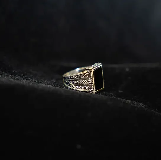 Black rectangular stone with unique design. Set in 925 silver. Size 10.5