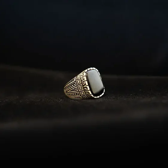 Black stone with unique design. Set in 925 silver. Size 9.5