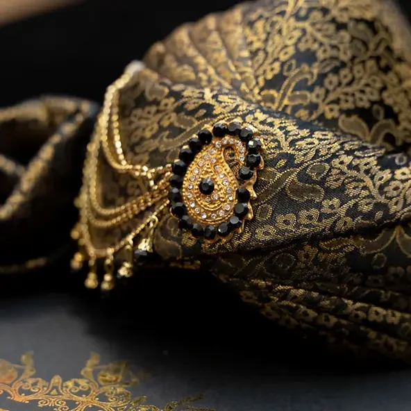 Men’s Wedding Kulla (Royal Hat) in Champagne and Gold. Comes with an embroidered design and a bedazzled jewel piece fit for a royal look. Pairs perfectly with our Wedding Collection Outfit. Size 8" adjustable.