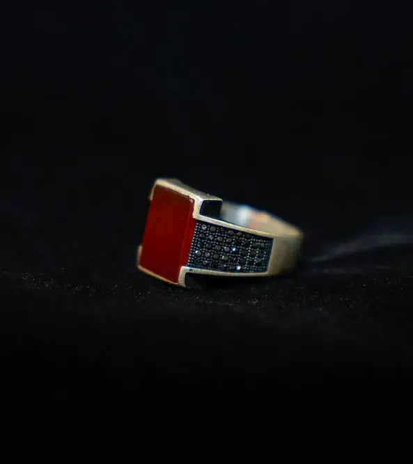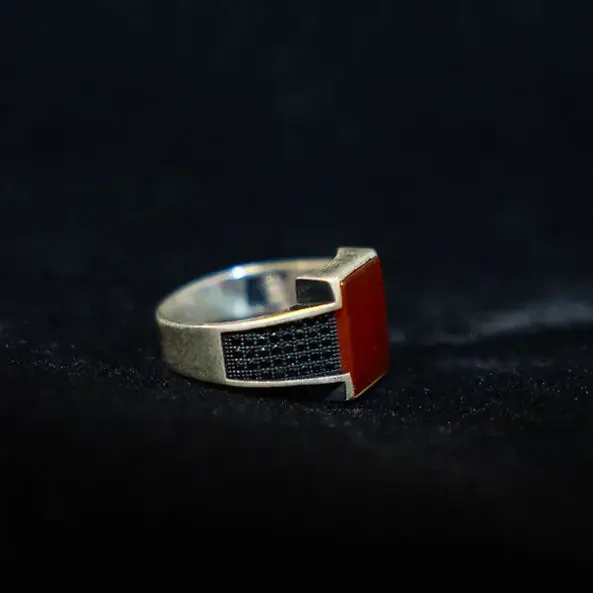 Red stone with gems on the side. Set in 925 silver. Size 12.5